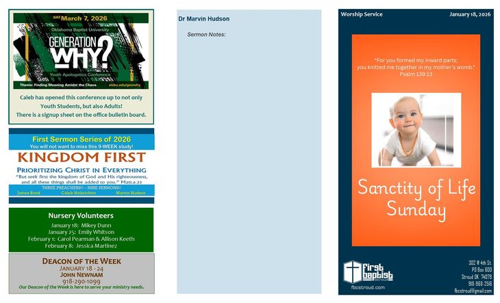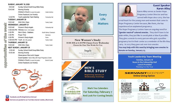 Welcome! If this is your first time visiting our site, we would love to get to know you! Our office is open Monday through Thursday. Stop by for a cup of coffee and a visit. Everyone is welcome to join us for Bible study and Worship! If you aren't able to join us physically, we livestream our Sunday morning service on our Facebook page, First Baptist Church, Stroud.